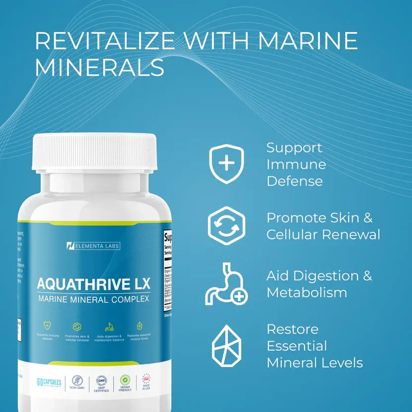 Aquathrive LX is built around ocean-sourced minerals and sea botanicals to help replenish what the body uses every day. It’s designed to support mineral balance, digestion comfort, metabolic support, and a steady sense of well-being.